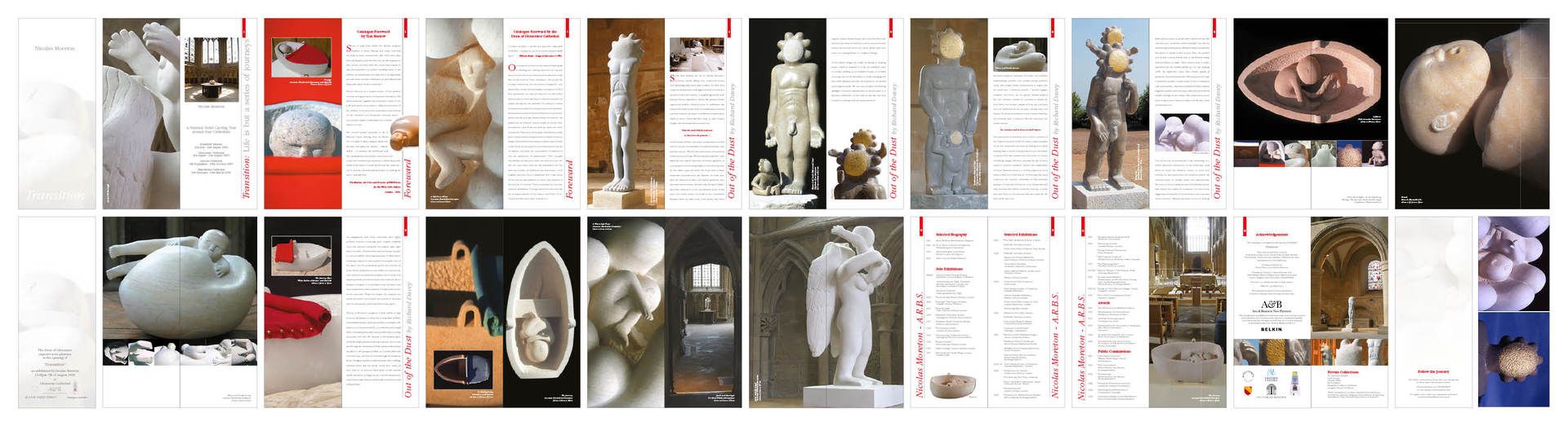 Accents of the red cloth & grey stone reflected in the typography, individually selected images showing details of each sculpture across the spreads and slender pages. Considerations was given to maximise the B2 paper size to get an additional