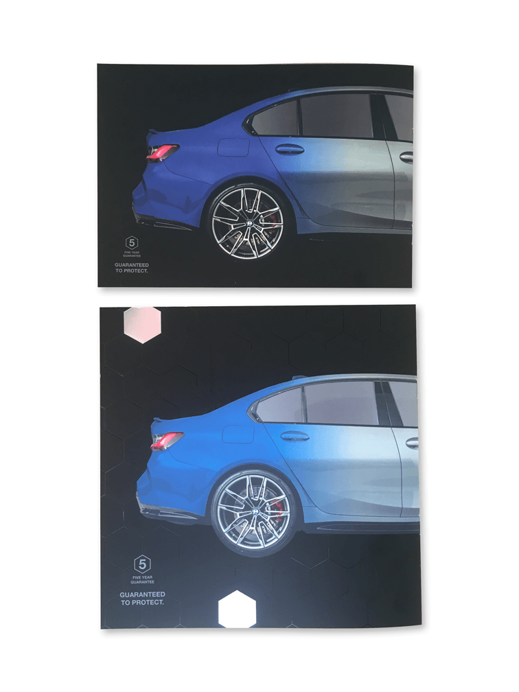 Full colour CMYK with Foil, x2 Varnish [Matt & Gloss] Spot Silver ink specific to each divisional brand i.e Porsche example shown.